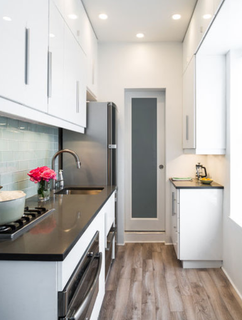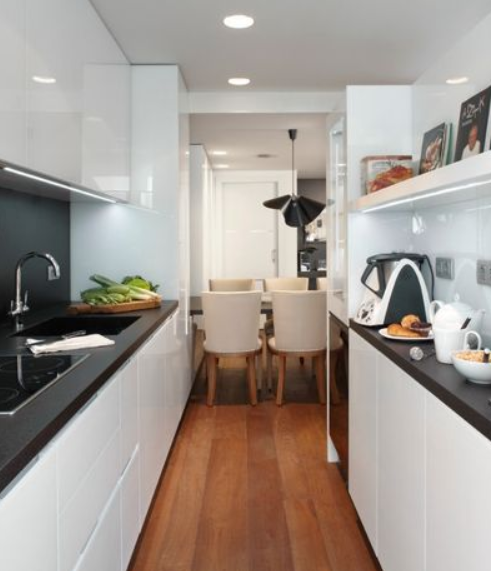 - Si la cocina es de planta estrecha la mejor manera de colocar los armarios es en línea.